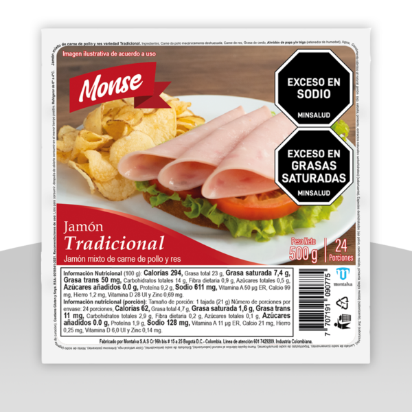 Jamón mixto de carne de pollo y res. Es el ideal para tus desayunos o snacks.• 125 gr / 6 unidades | • 250 gr / 12 unidades | • 500 gr / 24 unidades